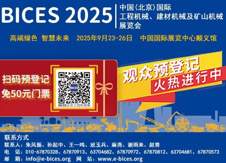 2025年9月23—26日,中國(北京)國際工程機械、建材機械及礦山機械展覽會(BICES 2025)將在中國國際展覽中心順義館舉辦。預(yù)計現(xiàn)場將匯聚超15萬人次來自國內(nèi)和全球工程機械、建材機械以及礦山、港口、交通、市政、水利、電力、化工等領(lǐng)域的用戶和觀眾,與展商朋友一起共襄盛舉。