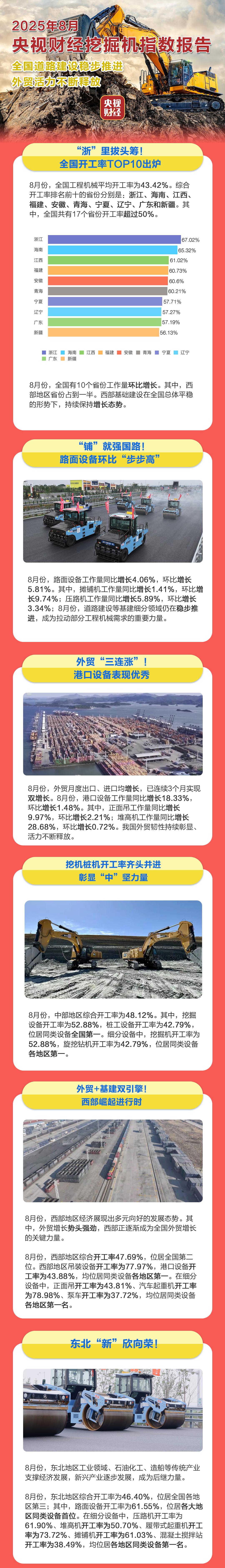 挖掘機是基礎(chǔ)設(shè)施建設(shè)的“標(biāo)配”,是反映基礎(chǔ)設(shè)施建設(shè)、觀察固定資產(chǎn)投資等經(jīng)濟變化的風(fēng)向標(biāo)。央視財經(jīng)與三一重工、樹根科技聯(lián)合打造的“央視財經(jīng)挖掘機指數(shù)”發(fā)布了最新相關(guān)數(shù)據(jù)。數(shù)據(jù)顯示,8月份,我國道路建設(shè)穩(wěn)步推進,路面設(shè)備表現(xiàn)活躍。外貿(mào)韌性持續(xù)、活力不斷釋放,港口設(shè)備表現(xiàn)優(yōu)秀。