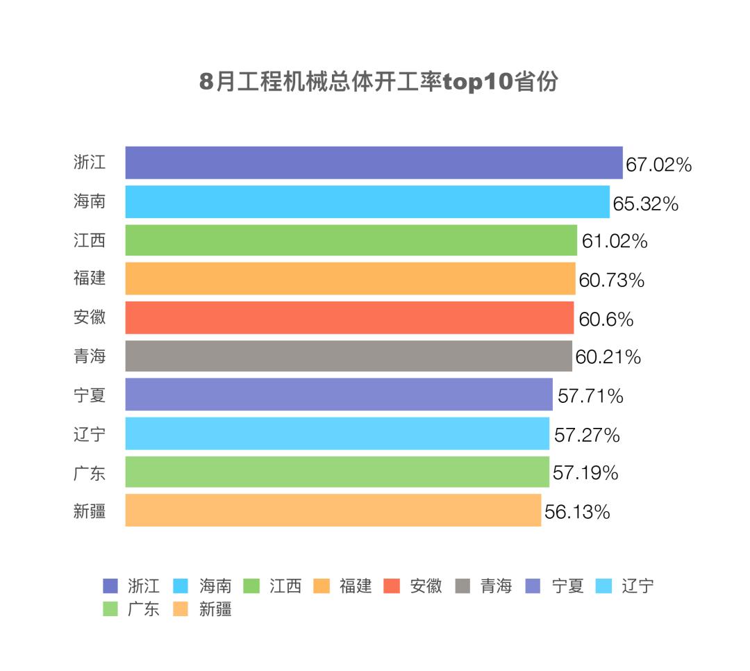 8月份,全國工程機械平均開工率為43.42%。綜合開工率排名前十的省份分別是:浙江、海南、江西、福建、安徽、青海、寧夏、遼寧、廣東和新疆。其中,全國共有17個省份開工率超過50%。